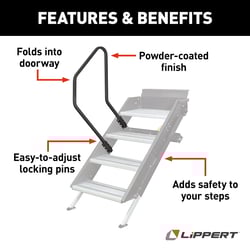 The Lippert Components 799640 Entry Assist Handrail provides safe, secure support when entering or exiting your RV. Designed specifically for use with Lippert Generation 3, Triple, and Quad Solid Step systems, this handrail enhances safety and stability for all passengers.