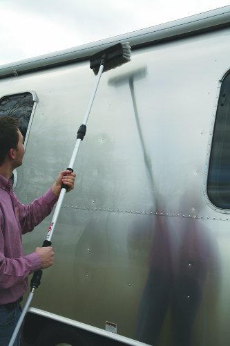 The Camco 43633 Adjustable Wash Brush makes cleaning your RV, boat, or vehicle easier with its extendable telescoping handle that adjusts from 43 inches to 71 inches, allowing you to reach high surfaces without a ladder. The 11-inch rectangular brush head features durable white and gray bristles that effectively clean without scratching surfaces.