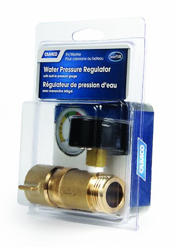 The Camco 40064 Brass Water Pressure Regulator with Gauge protects your RV's plumbing system and water hoses from damage caused by excessive city water pressure. This essential RV accessory helps prevent burst hoses, leaking fixtures, and damaged water heaters that can result from high-pressure municipal water sources.