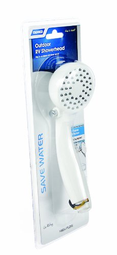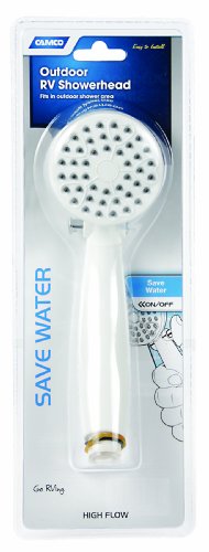 The Camco 44023 RV Outdoor Shower Head is designed specifically for recreational vehicle outdoor shower systems, providing convenient water control and high-flow performance. This white shower head features an integrated on/off switch that allows you to temporarily stop water flow without adjusting the faucet, helping conserve water while soaping up or shampooing.