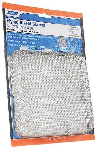 The Camco 42151 Water Heater Flying Insect Screen is designed to protect your RV water heater from wasps, mud daubers, and other insects that can build nests in the vent opening. This precision-engineered screen fits Suburban 6-gallon water heaters with flush mount door configurations.