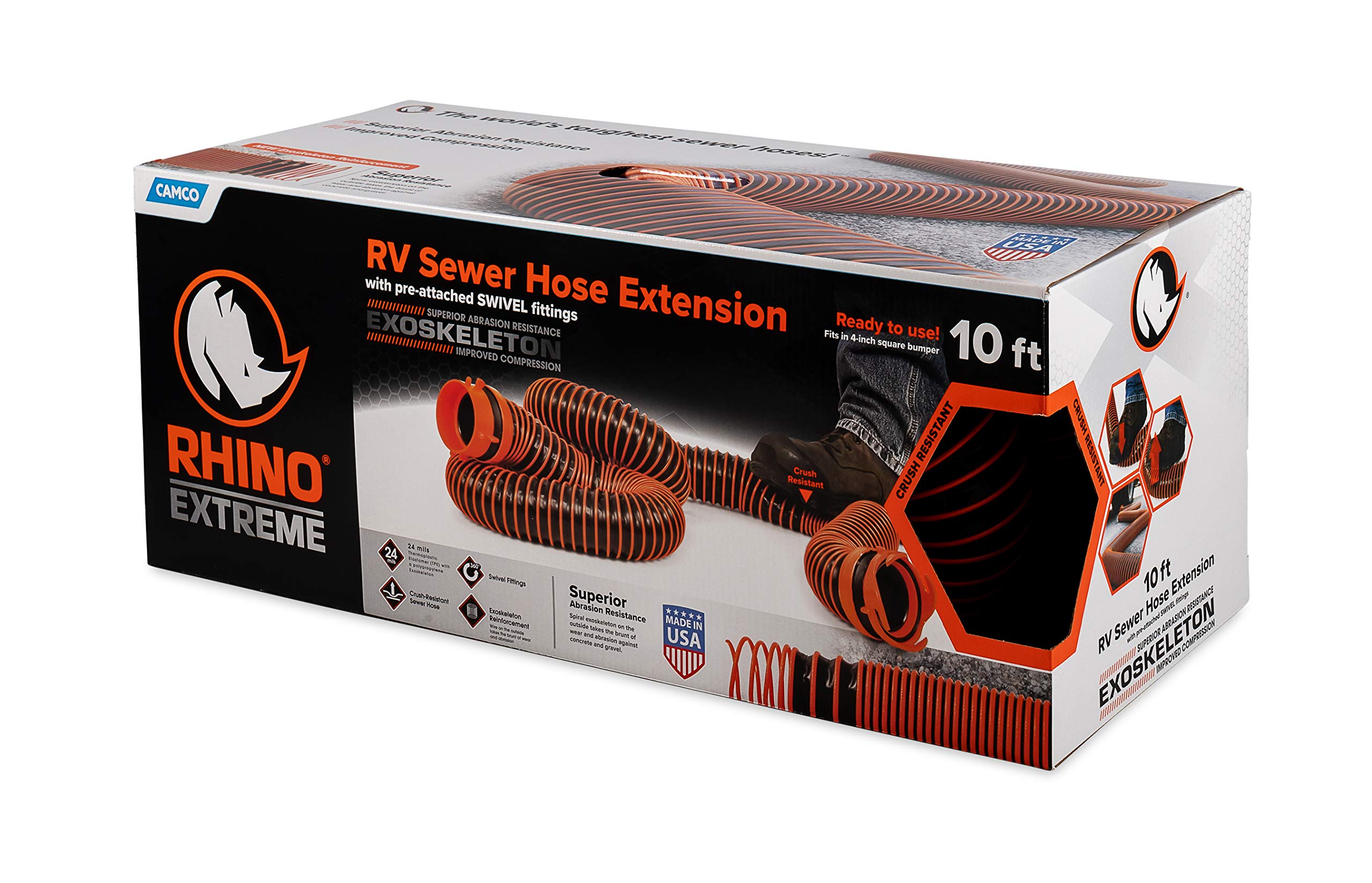 The Camco RhinoEXTREME 10-foot sewer hose extension allows you to extend the reach of your existing RhinoEXTREME hose kit, providing the extra length you need for those hard-to-reach dump stations. Built with the same heavy-duty construction as the complete RhinoEXTREME kit, this extension features superior durability and crush protection that RVers demand.