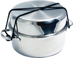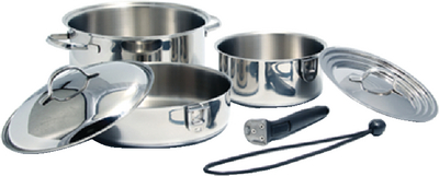 The Camco 43920 Premium Nesting Cookware Set is constructed from high-quality 18/10 stainless steel with an aluminum core for superior heat distribution. This versatile cookware is dishwasher safe, induction compatible, and oven-safe when the removable handles are detached.