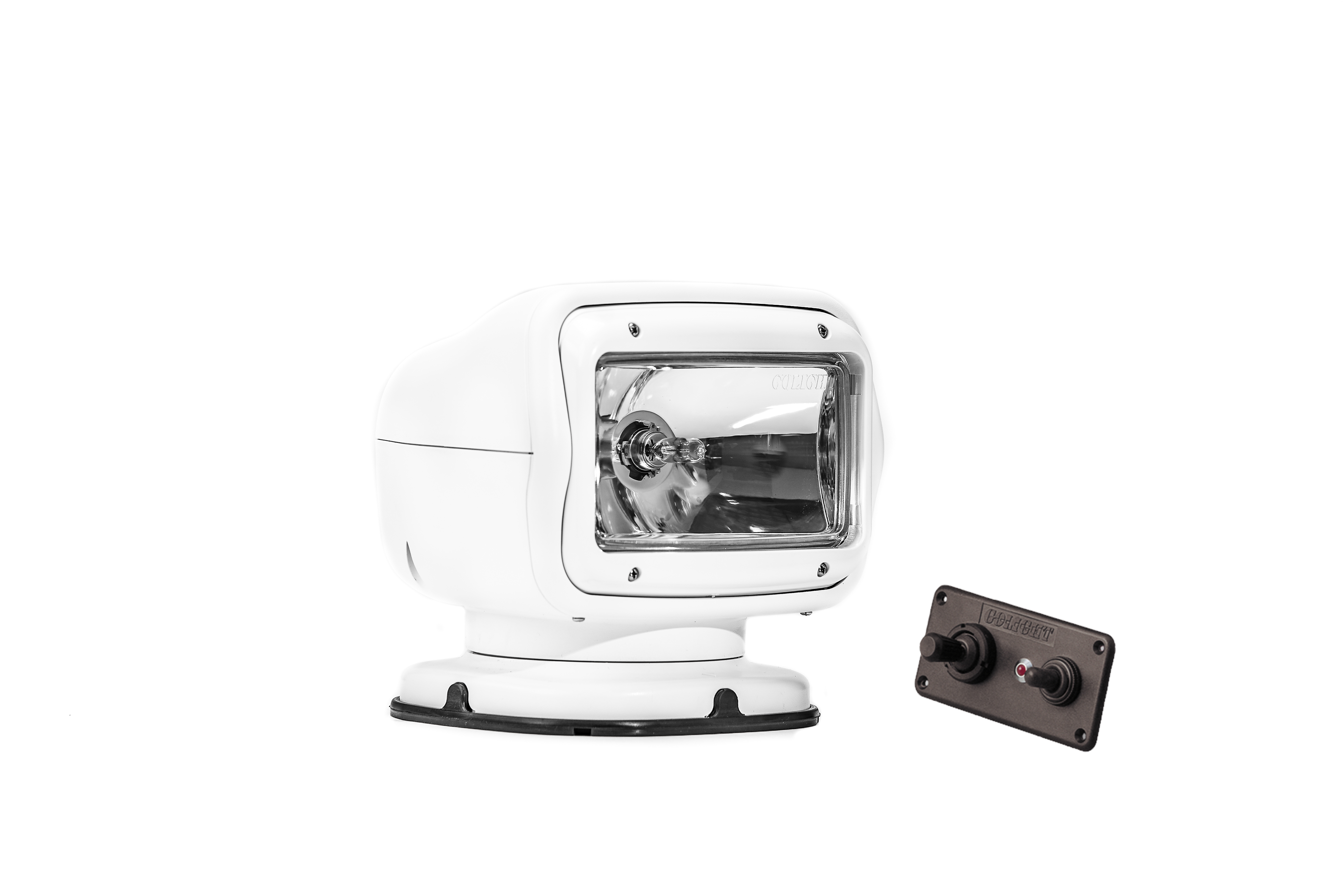 The Golight 2020GT RadioRay GT Series delivers professional-grade remote-controlled lighting with enhanced durability and precision. This permanent mount white halogen spotlight features a hard-wired dash mount remote control system, offering 370° rotation and 135° tilt for comprehensive illumination coverage in marine, commercial, and emergency vehicle applications.