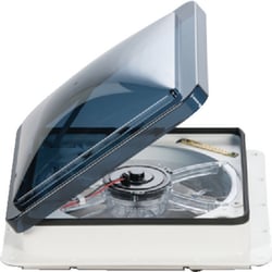 The Fan-Tastic Vent Co Model 3350 is an automatic roof vent fan designed for RVs and campers, featuring intelligent climate control with a built-in thermostat and rain sensor. By presetting the thermostat within the 22°F to 123°F range, the smoke polycarbonate dome cover opens automatically and the fan begins operating to ventilate your space. When the desired temperature is reached, the dome automatically closes and the fan shuts off, providing hands-free climate management.
