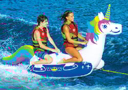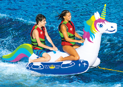 The Wow Sports Unicorn towable tube brings whimsical fun to the water with seating for 1-2 riders. Designed with large custom-shaped side pontoons, this inflatable water tube provides easy boarding and delivers a stable, secure ride whether you're cruising or catching air behind the boat.