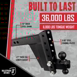 The Bulletproof Hitches ED258 is a heavy-duty adjustable trailer hitch designed for extreme towing applications. Built from solid steel with a durable black textured powder coat finish, this hitch ball mount fits 2.5-inch receivers and delivers exceptional strength with a 36,000-pound gross trailer weight capacity and 6,000-pound tongue weight rating.