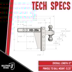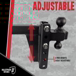 The Bulletproof Hitches HD206 is a heavy-duty adjustable ball mount designed for serious towing applications. This robust hitch features a solid steel construction with a durable black textured powder coat finish that resists corrosion and wear.