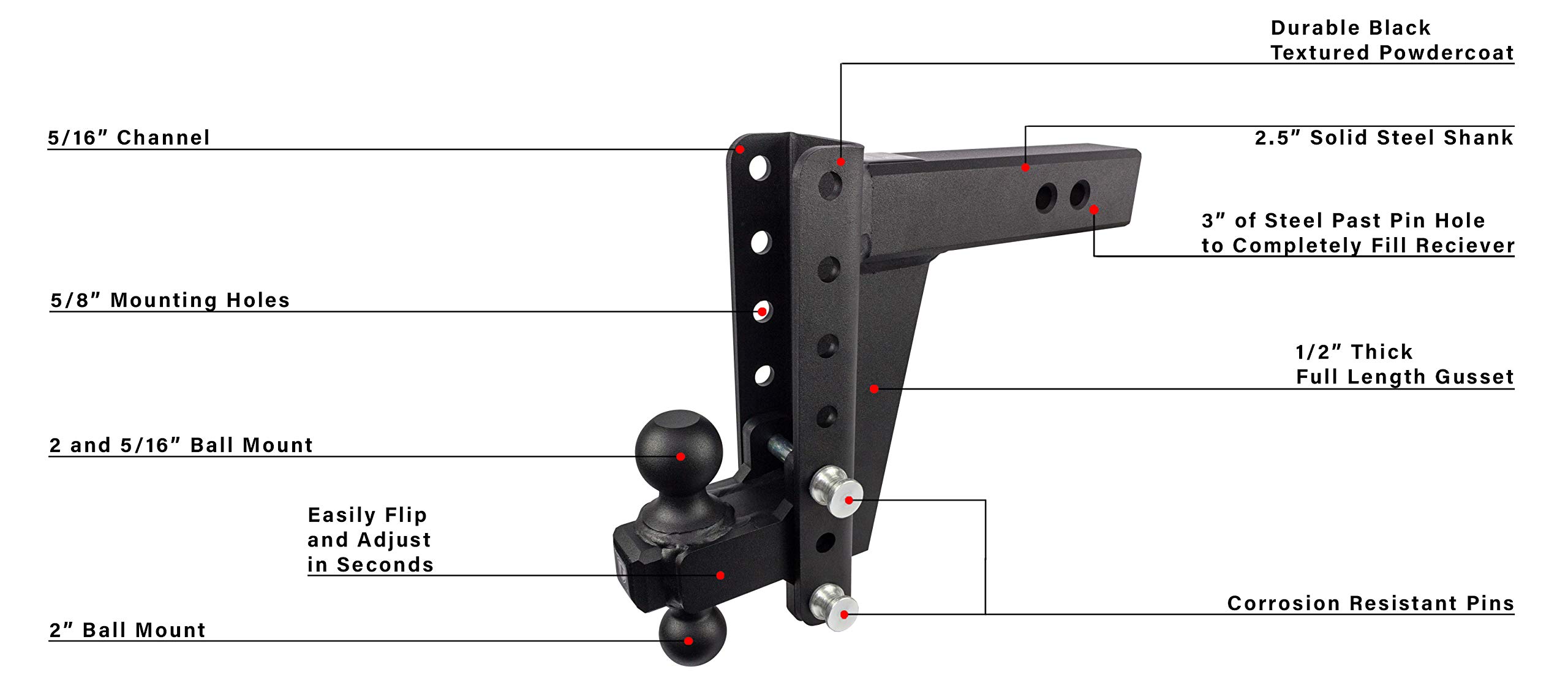 This non-swivel, non-extendable ball mount is ideal for towing heavy trailers, equipment haulers, horse trailers, and large recreational vehicles. The adjustable height design allows you to achieve proper tongue angle and weight distribution for safer towing. Both hitch balls come pre-installed with a durable powder coat finish to match the mount.