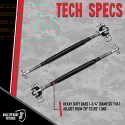 The Bulletproof Hitches STABILIZERBARS are frame-mounted stabilizer draw bars designed to reduce trailer sway and improve towing stability. These heavy-duty bars attach directly to your vehicle's frame and work in conjunction with your trailer hitch system to minimize lateral movement and provide a more controlled towing experience.
