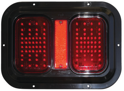 The Diamond Group DG52720PB is a weatherproof LED tail light featuring 104 diodes in a large surface light source, designed for professional replacement of incandescent trailer lighting systems. This rectangular tail light provides stop, tail, and turn signal functions with a large center-mounted reflector that increases visibility.