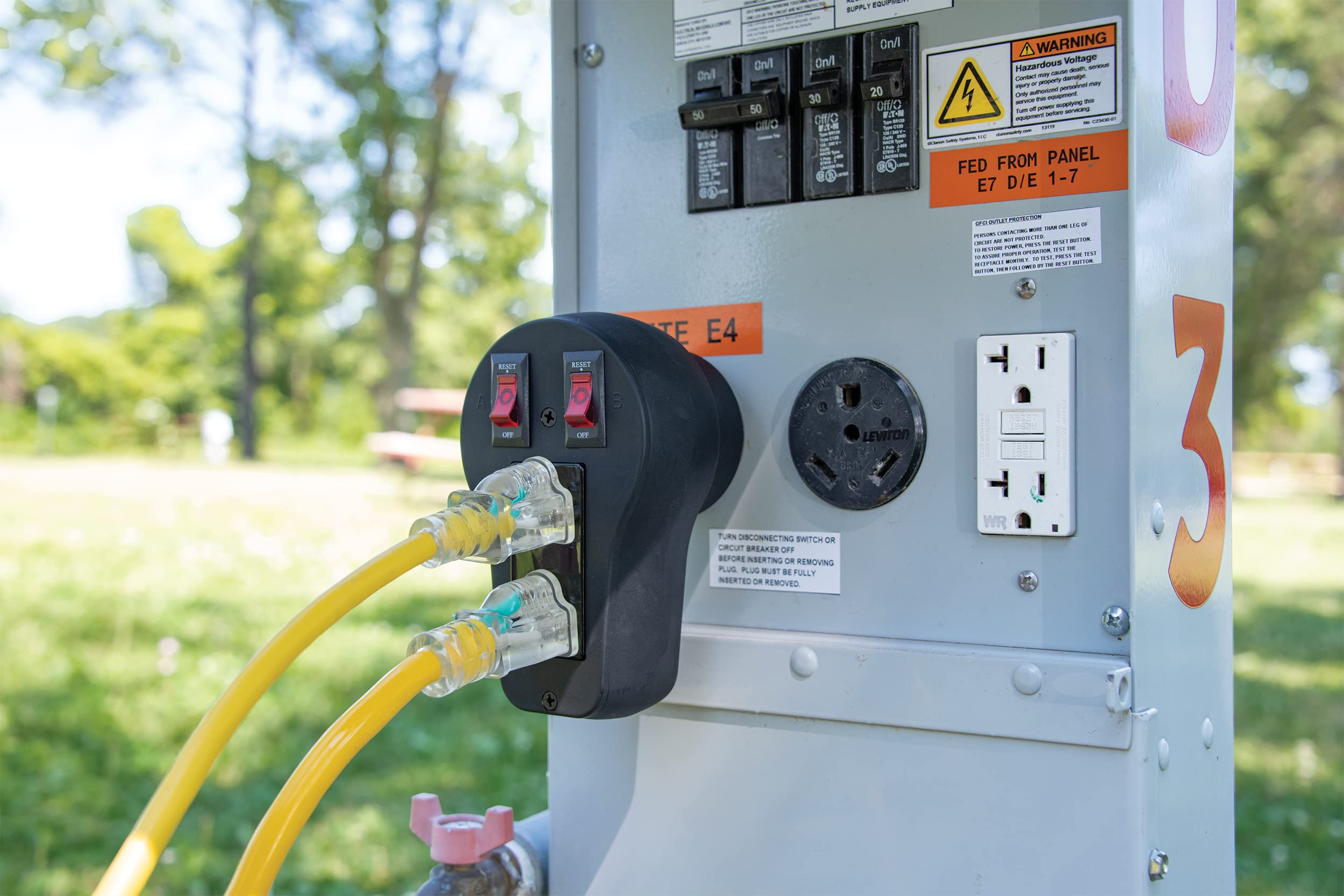 This adapter is ideal for powering additional accessories like portable heaters, fans, tools, or charging stations without drawing power from your RV's main electrical system. The illuminated circuit breakers make it easy to identify and reset tripped circuits, while the compact design ensures compatibility with most RV pedestal configurations.