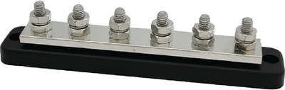 This compact bus bar simplifies electrical distribution systems by providing multiple connection points from a single power source, reducing wire clutter and improving circuit organization in boats, RVs, and other mobile applications.