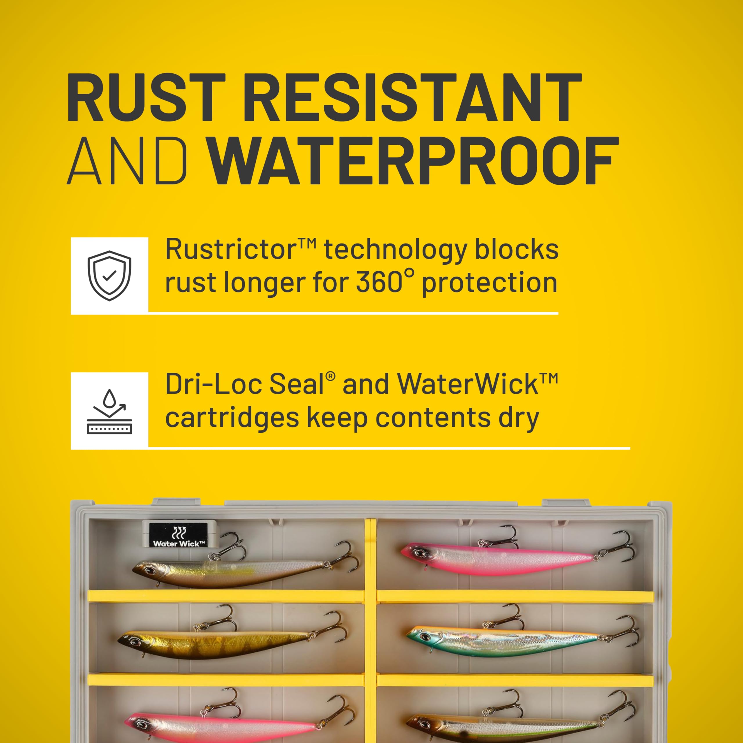 - Rustrictor technology delivers 360-degree rust prevention for hooks and metal tackle