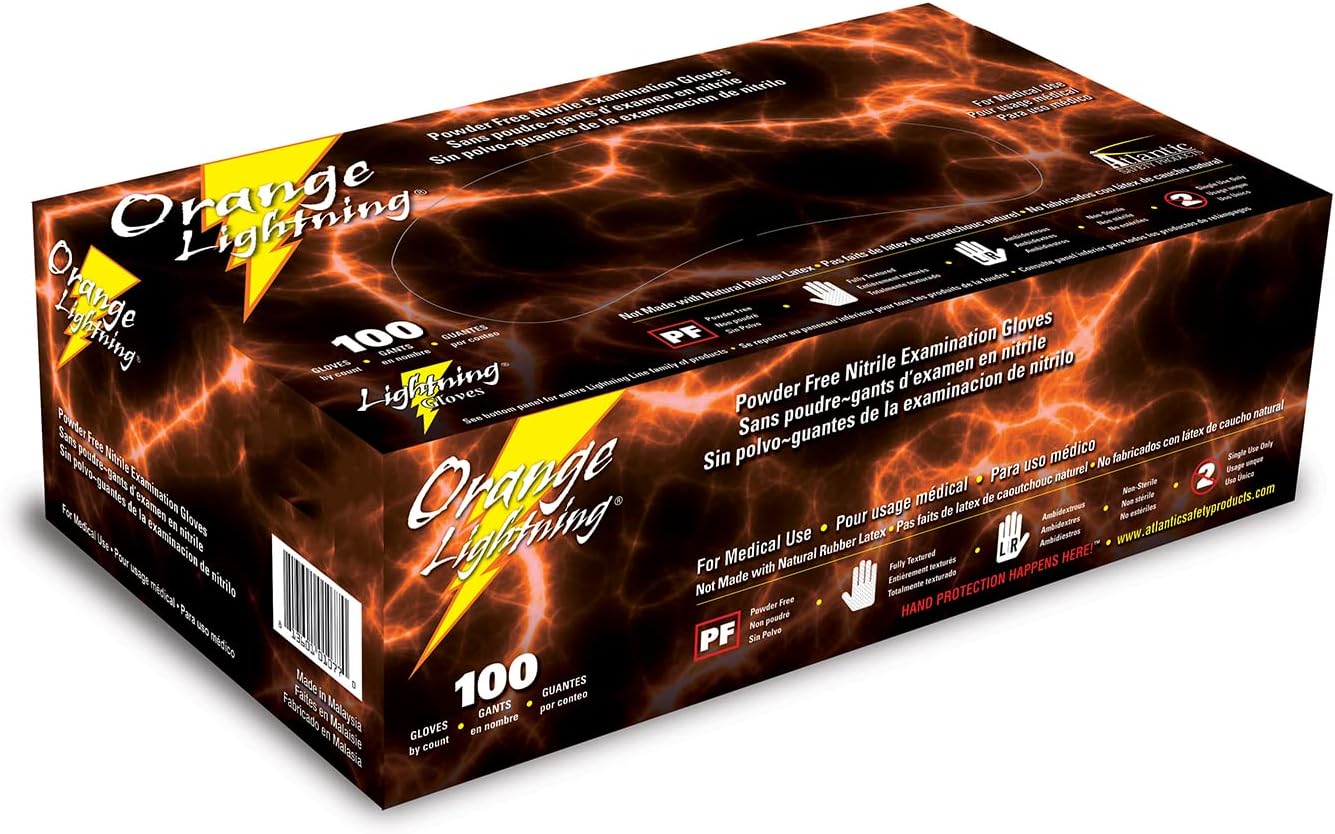 The Atlantic Safety Company Orange Lightning nitrile disposable gloves provide excellent barrier protection for automotive, industrial, and medical applications. These high-visibility safety orange gloves feature a unique formulation designed to reduce excess perspiration while keeping hands comfortable during extended wear.