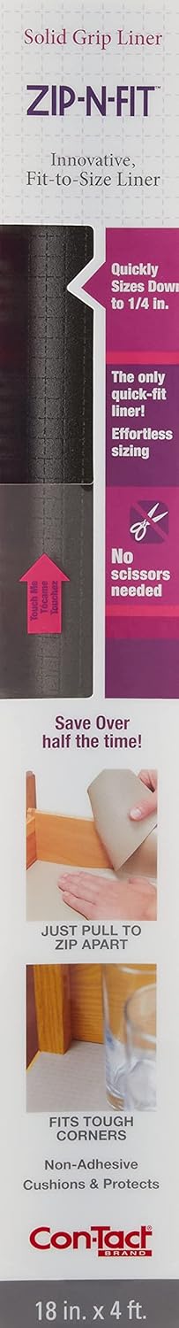 The Con-Tact Zip-N-Fit shelf liner features an innovative perforated design with lines every 1/4 inch apart, allowing you to simply pull the liner apart without scissors or cutting tools for a perfect custom fit. This non-adhesive shelf and drawer liner measures 18 inches by 4 feet and comes in a sleek black color.