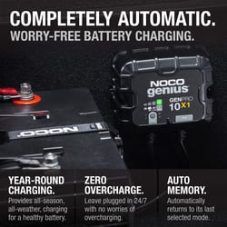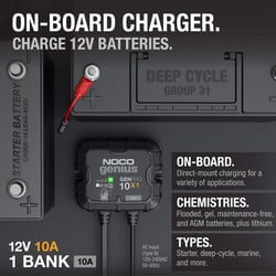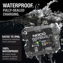 The Noco Genius GENPRO10X1 is a fully-automatic, waterproof on-board battery charger designed for marine, RV, and automotive applications. This advanced 1-bank charging system delivers 10 amps of charging power with intelligent multi-stage charging technology that adapts to your battery's needs.