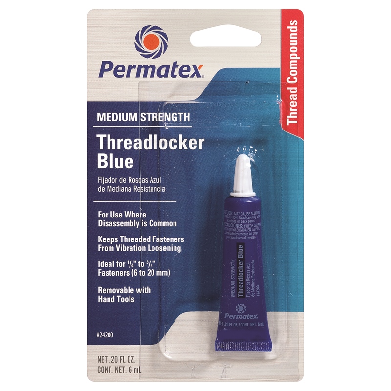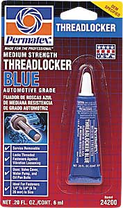 Permatex 24200 Blue Threadlocker is a medium-strength anaerobic adhesive designed to lock and seal threaded fasteners while preventing loosening from vibration and shock. This versatile threadlocker eliminates the need for mechanical locking devices like lock washers, lock nuts, and cotter pins.