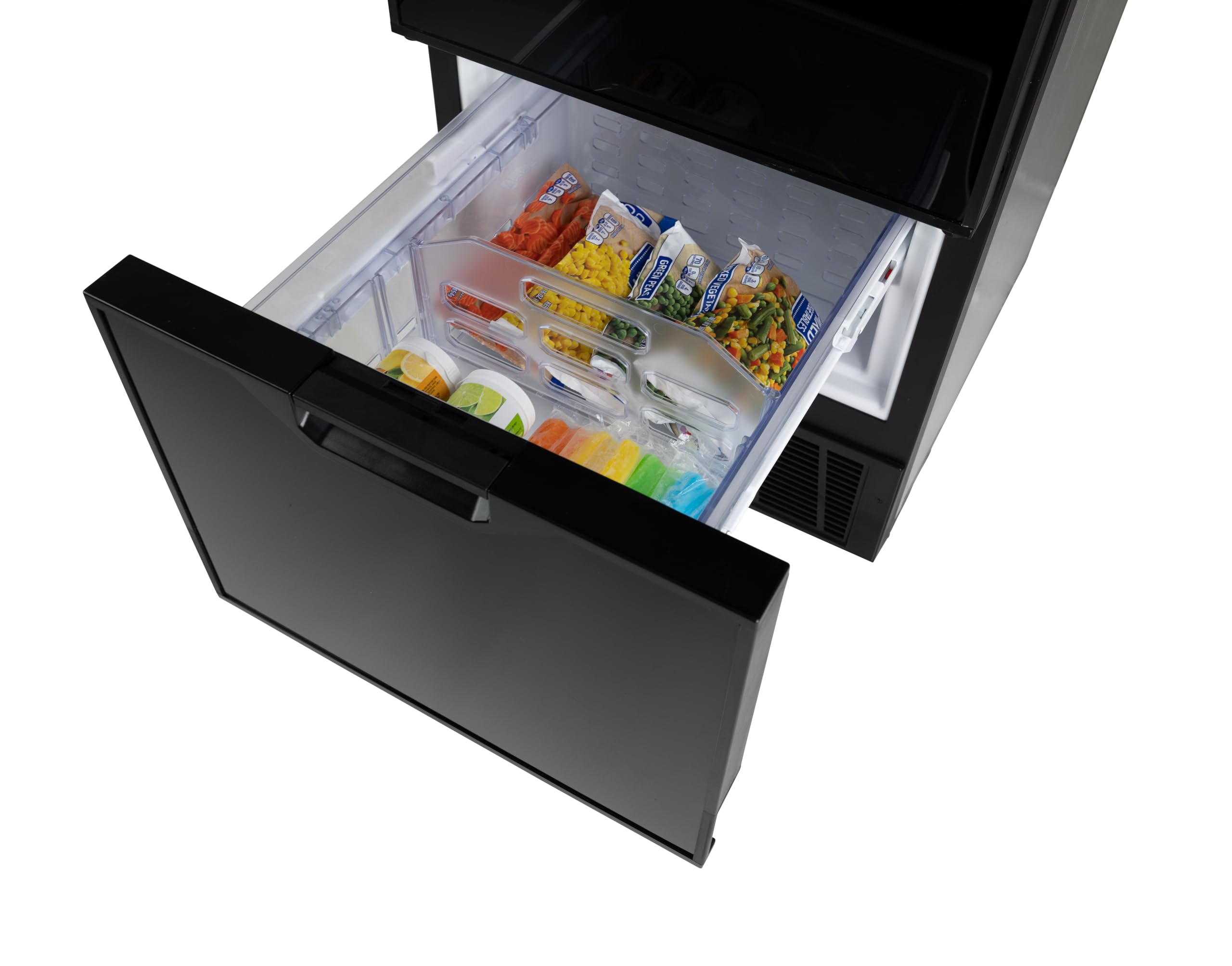 This compressor refrigerator offers superior cooling performance compared to absorption models, with faster pull-down times and consistent temperature control regardless of ambient conditions or vehicle orientation. The modern black finish and integrated handle design provide a premium look that complements contemporary RV interiors.