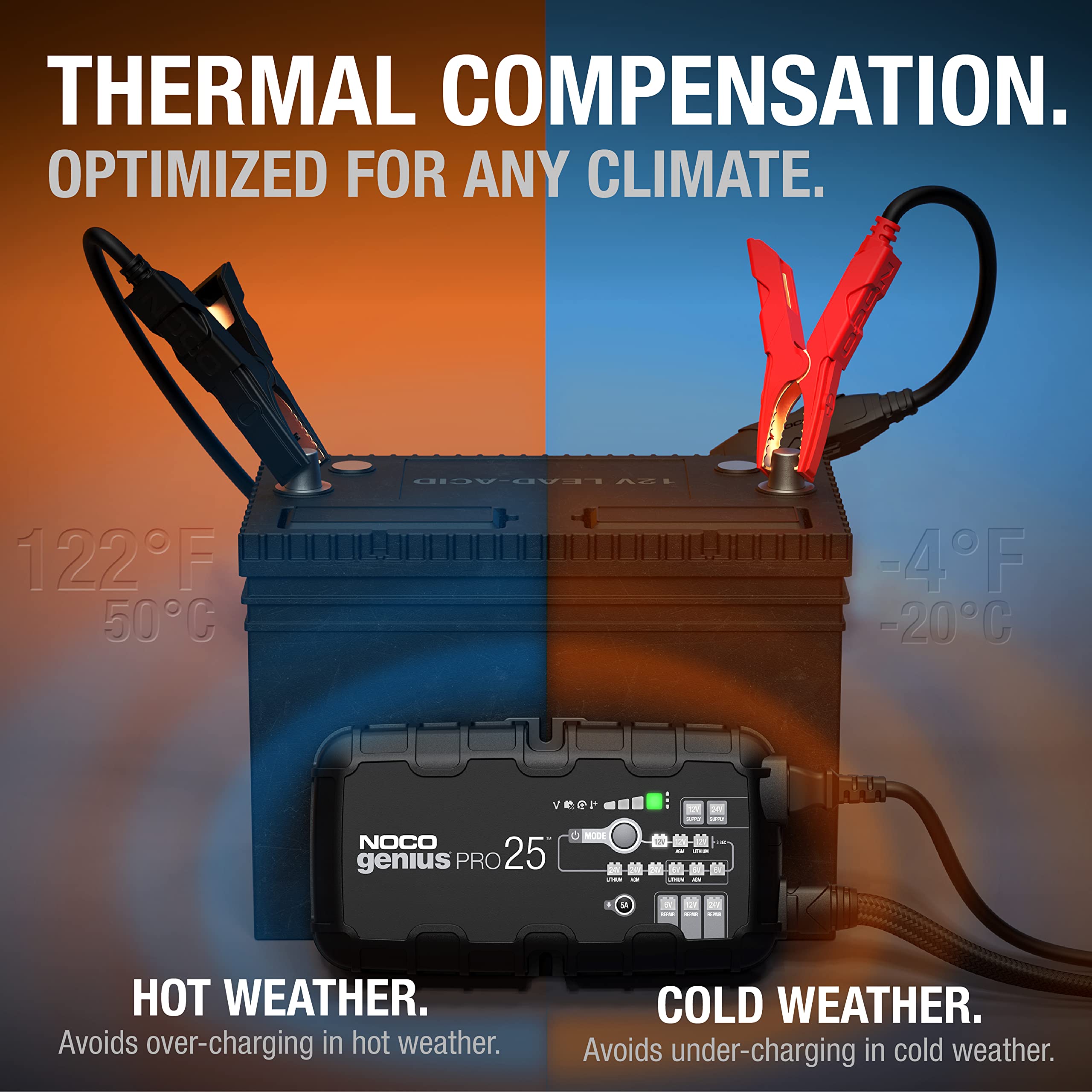 • Integrated thermal sensor automatically adjusts charging based on ambient temperature to prevent over-charging in hot conditions and under-charging in cold climates