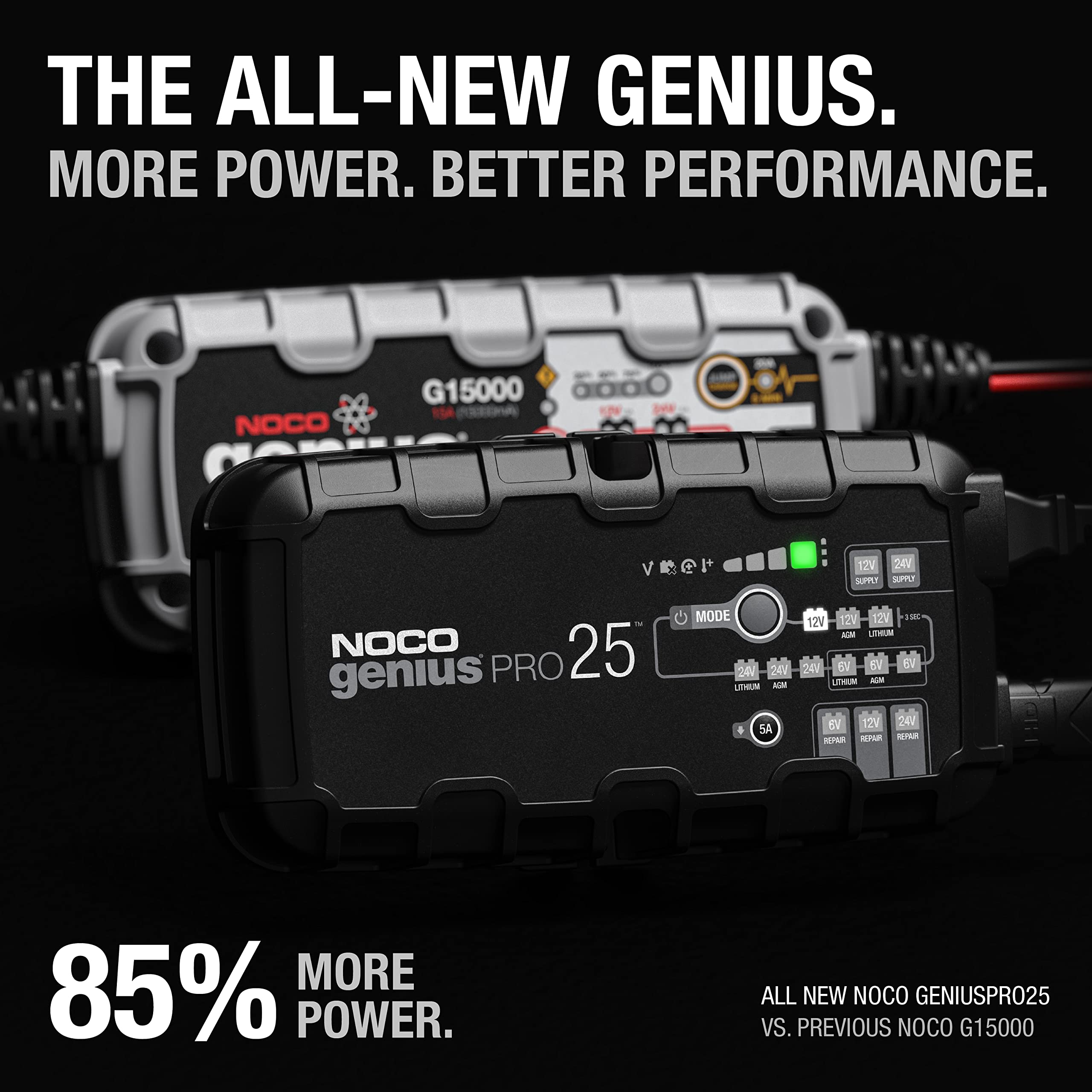 The Noco Genius GENIUSPRO25 is a professional-grade battery charger and maintainer designed for demanding automotive, marine, and powersports applications. This powerful 25-amp charger supports multiple battery types and voltages, making it the ultimate tool for professional technicians and serious enthusiasts.
