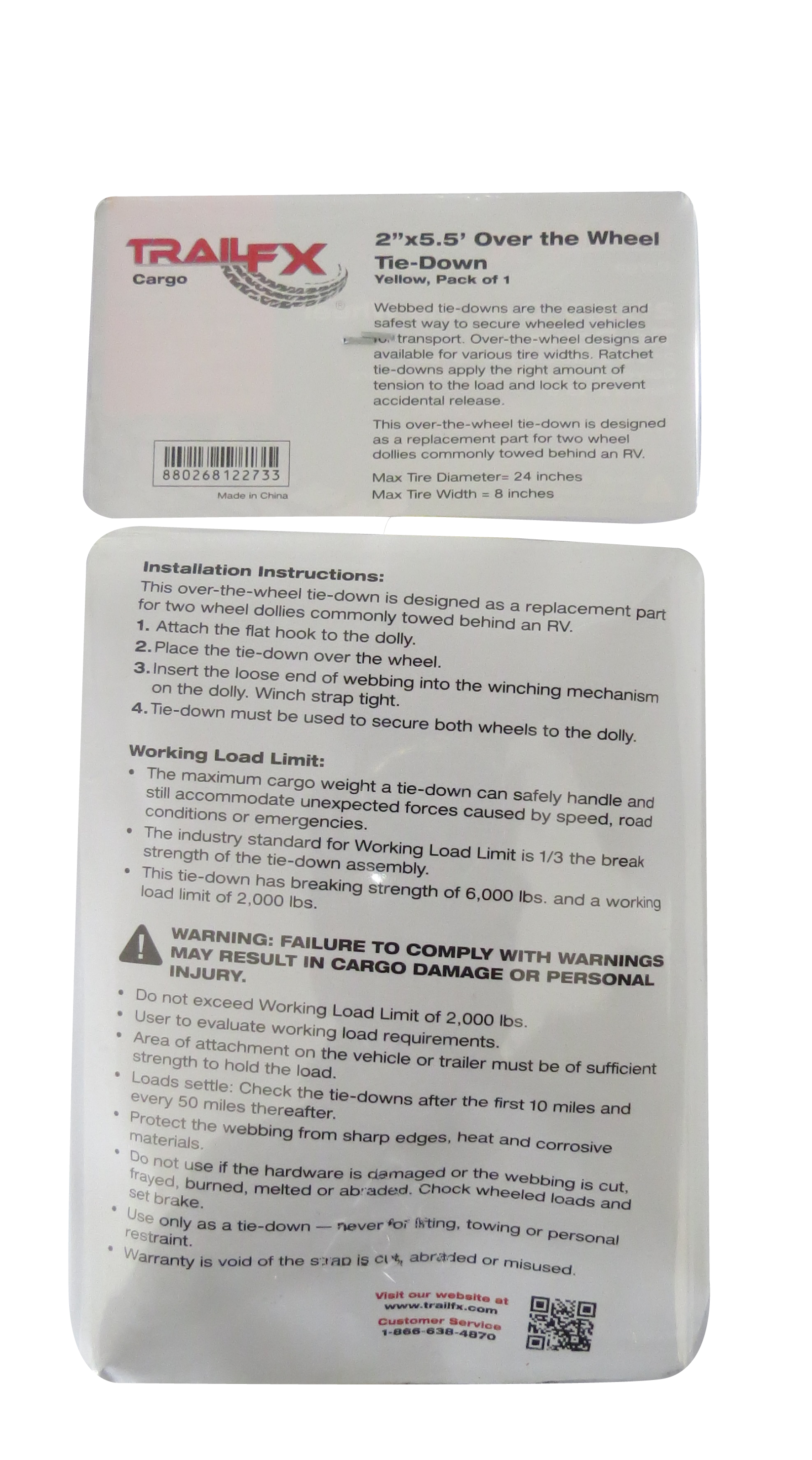 TrailFX A92021Y Over The Wheel Tie Down 5.5 Ft X 2 In 2000 Lb Cap W/o Ratchet Yellow Sgl