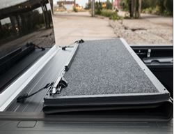 The TrailFX TFX5705 Hard Tri-Fold Tonneau Cover delivers reliable truck bed protection with a sleek, low-profile design. This non-lockable cover features durable black powder-coated aluminum panels with carpeted underside to protect your truck bed finish from scratches and abrasion.