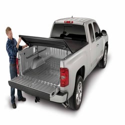 This tonneau cover installs without drilling and provides an affordable solution for protecting cargo from the elements while maintaining a sleek appearance. The tri-fold configuration allows you to access your entire truck bed or fold sections as needed for hauling taller items.