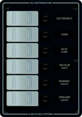 The Blue Sea Systems 8053-BSS Contura Switch Panel is a vertical 6-position water resistant rocker switch panel designed for marine, RV, and powersports electrical system management. This compact gray panel provides organized control for multiple 12V DC circuits in a durable, weather-resistant housing.