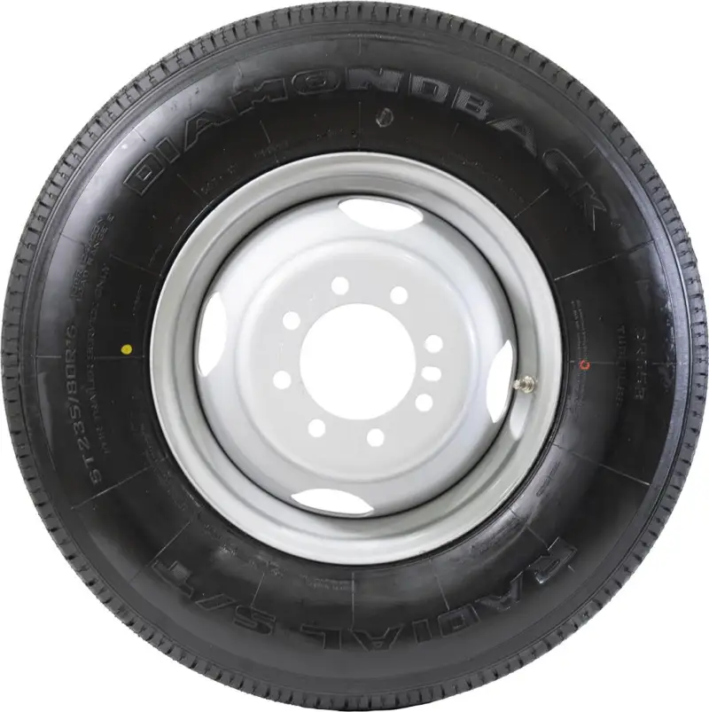 The Taskmaster ADB16R477HDM Diamondback tire and wheel assembly delivers heavy-duty performance for utility trailers, stock trailers, RVs, and campers. This complete assembly features an ST235/80R16 radial trailer tire mounted on a 16x6 inch wheel with an 8x6.5 inch (8x165.1mm) bolt pattern and 4.77 inch pilot diameter.