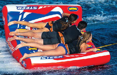 The Wow Sports Power Steer delivers an innovative riding experience with its unique U-shaped design and intuitive steering system. This 3-person towable tube puts riders in control, allowing you to carve across the wake, lean into turns, and time your jumps for maximum airtime—all while the boat maintains a straight path.