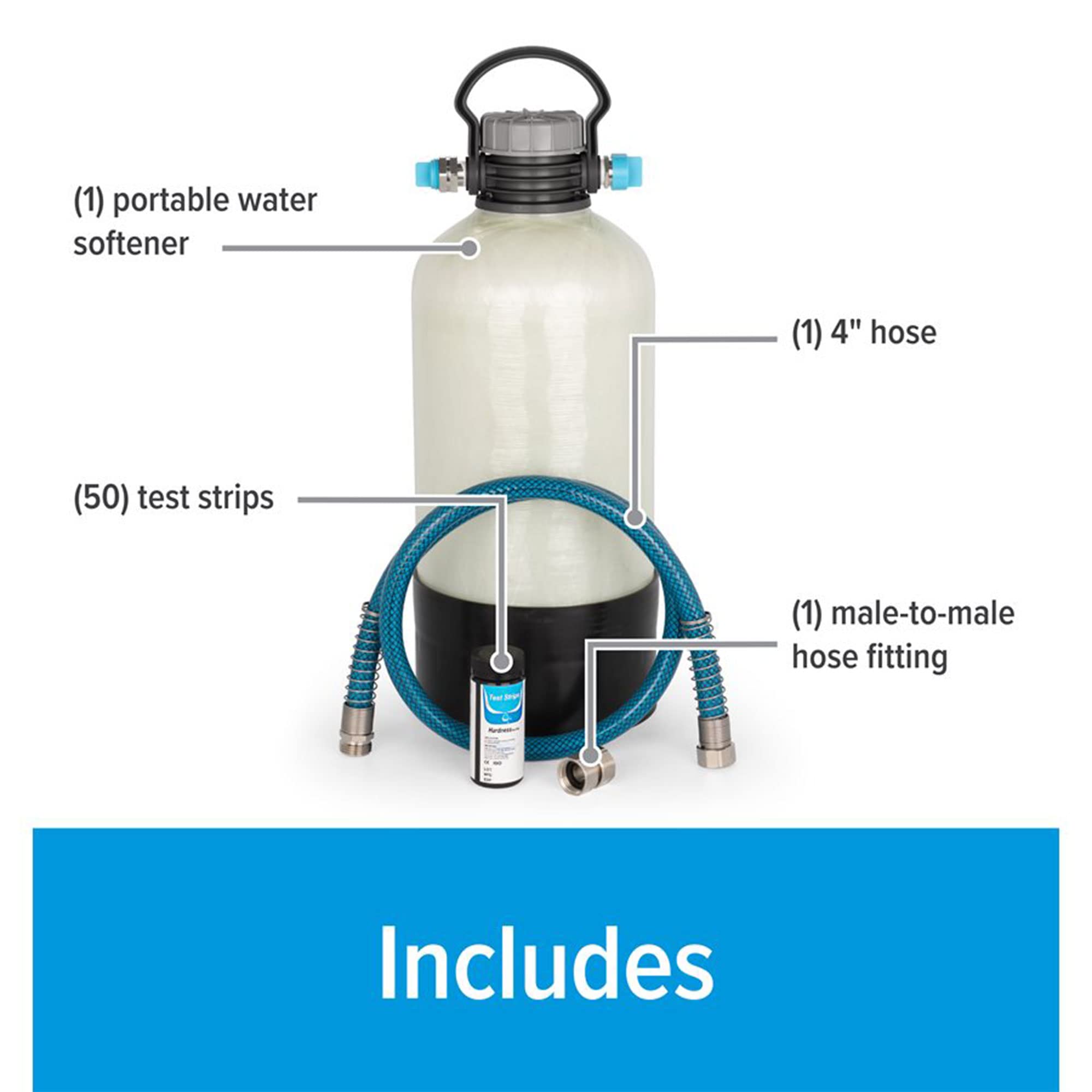 This portable water softener connects inline between your water source and RV or marine system, providing immediate softening benefits. The included test strips allow you to monitor water quality and determine when regeneration is needed. Everything required for installation and use comes in the package, making setup quick and straightforward.