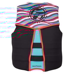 The Full Throttle Women's Rapid-Dry Flex Back Vest is specifically designed for women's watersports activities, featuring a shorter torso cut that provides an improved fit for female body types. This U.S. Coast Guard approved and Transport Canada approved life vest combines safety with comfort and style in a vibrant pink design.