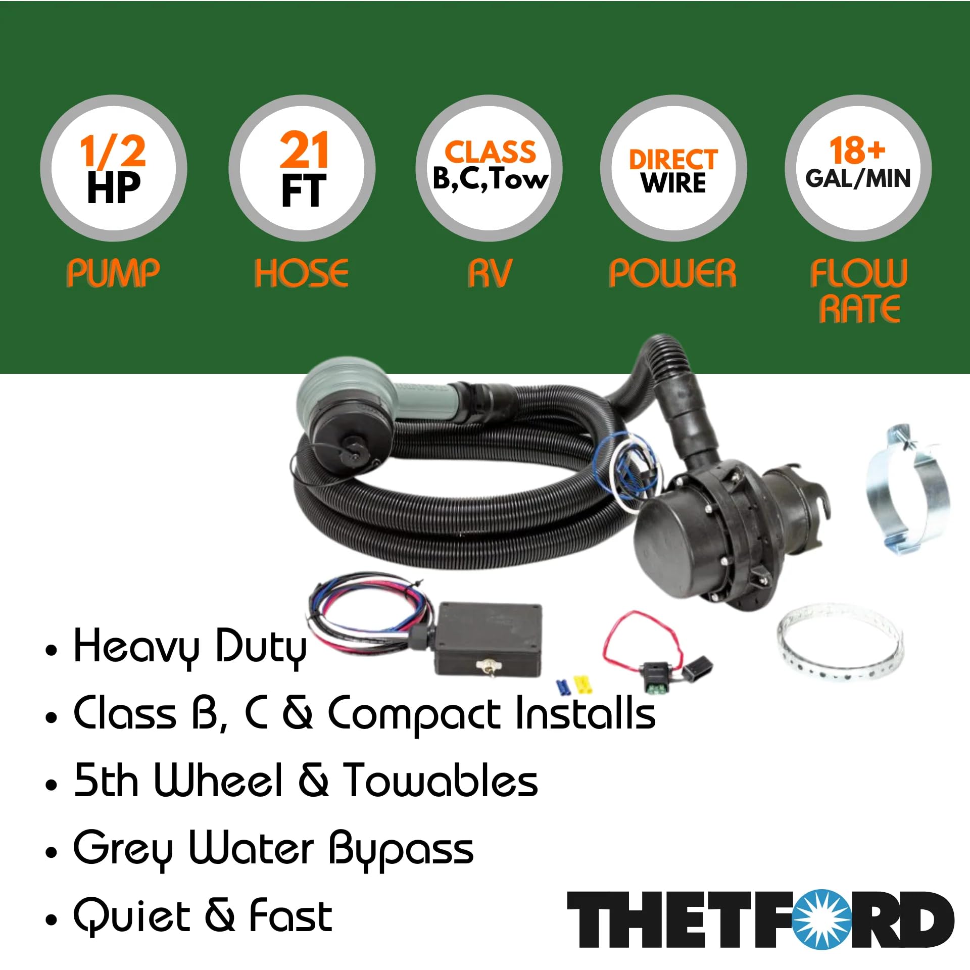 • 21-foot extendable discharge hose with versatile nozzle that fits six dump station inlet sizes