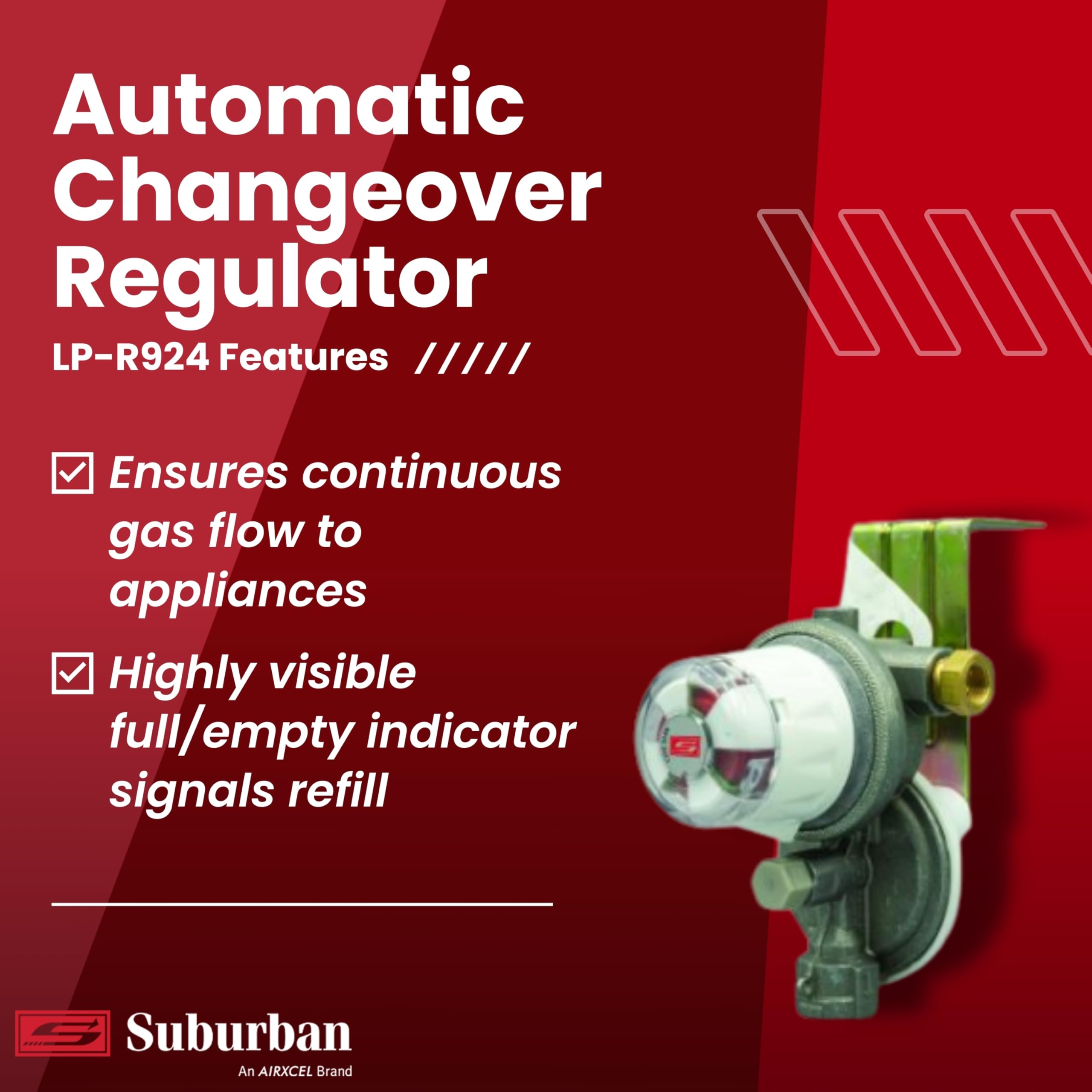 The Suburban Manufacturing LPR924 is an automatic changeover LP gas regulator designed for RV propane systems. This essential safety device automatically switches from an empty service cylinder to a full reserve cylinder, ensuring uninterrupted gas flow to all your appliances without manual intervention.
