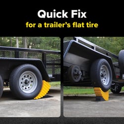 This complete kit includes one curved trailer aid ramp, one wheel chock, and one rubber base pad. The durable plastic honeycomb design provides exceptional strength while remaining lightweight and portable. The included chock and base pad ensure your trailer stays securely in place during tire changes, making roadside repairs safer and more convenient.