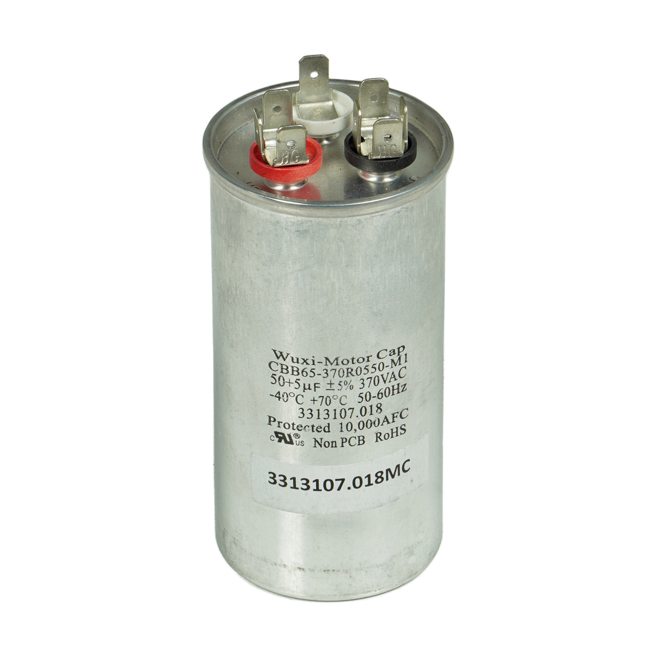 The MC 3313107.018MC is an aftermarket dual run motor capacitor designed specifically for Dometic RV air conditioner systems. This capacitor features a 50/5 microfarad rating at 370V AC, providing reliable power delivery to both the compressor and fan motor in compatible air conditioning units.