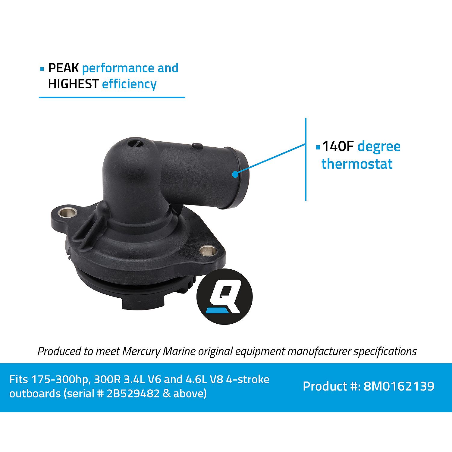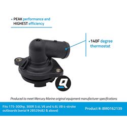 The Quicksilver 8M0162139 is a precision-engineered 140°F replacement thermostat designed specifically for select Mercury 175-300hp and 450R outboard engines with 3.4L V6 and 4.6L V8 4-stroke powerheads (serial number 2B529482 and above). This genuine OEM component ensures your outboard maintains optimal operating temperature for peak performance and fuel efficiency.