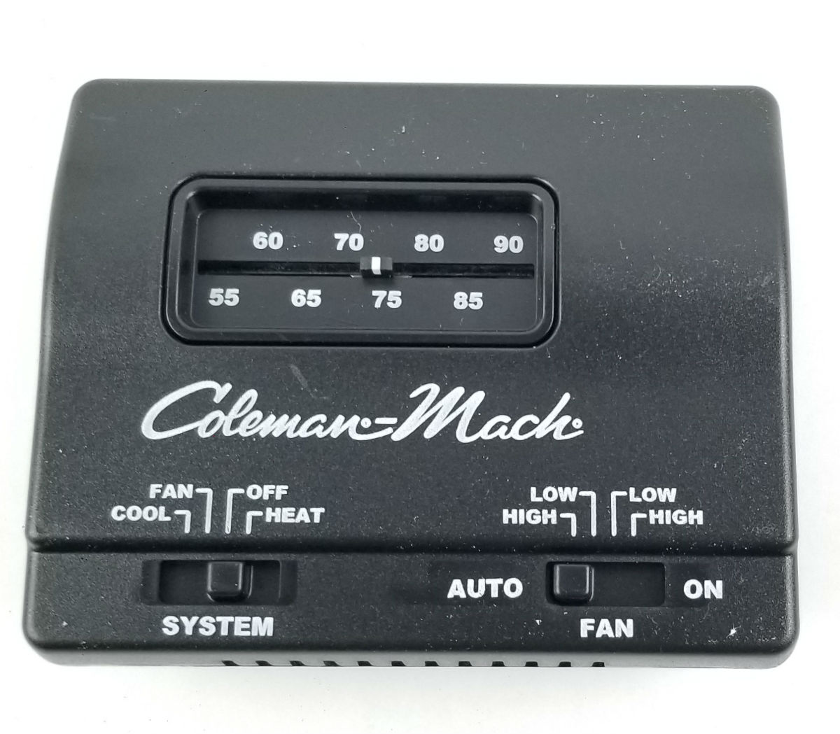 The Coleman-Mach 73303861 is a single-stage analog wall thermostat designed specifically for RV air conditioning systems. This cool-only thermostat provides simple, economical temperature control for a wide variety of Coleman Mach RV air conditioners without the complexity of digital controls.
