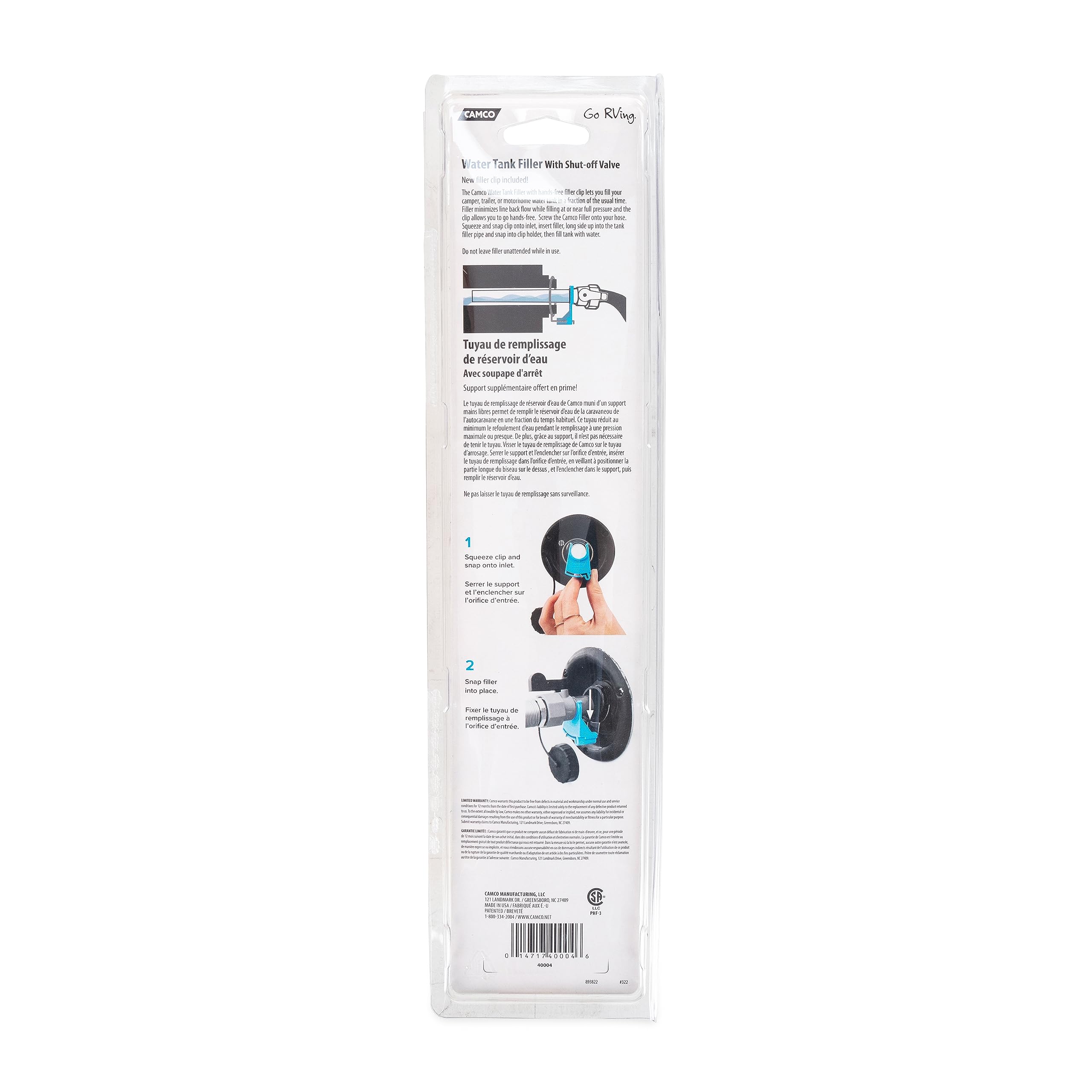 Simply attach the adapter to your water hose, insert it into your RV's gravity fill port, secure it with the included clip, and turn on the water. The shut-off valve lets you stop the flow instantly when your tank reaches capacity, eliminating spills and water waste.