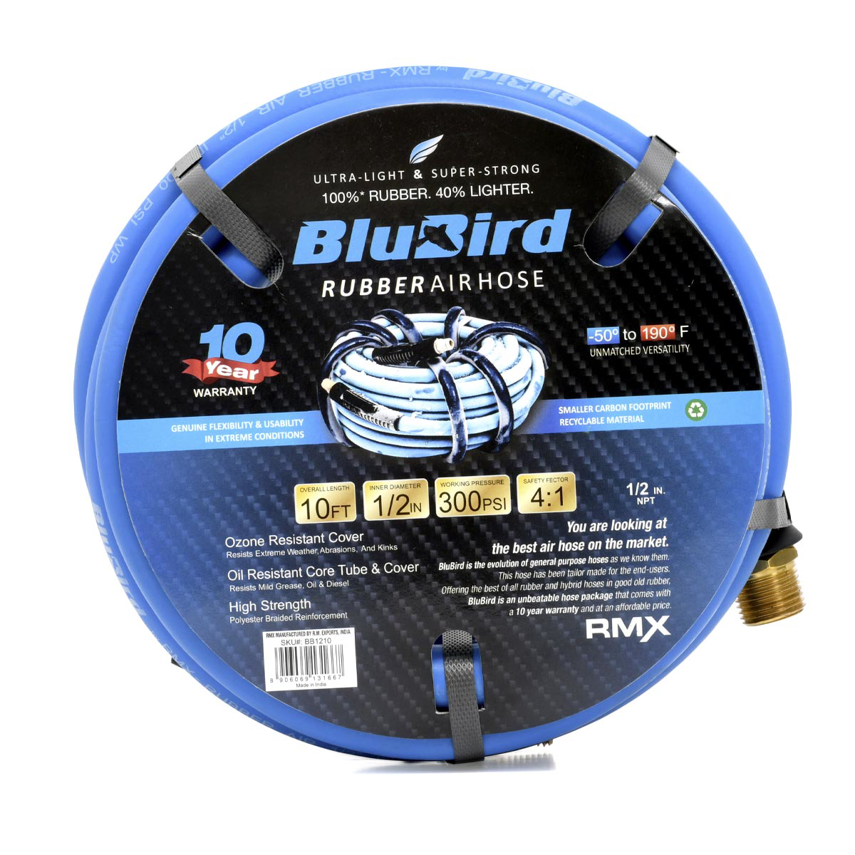 BluBird 10010276 Rubber Air Hose Assembly 1/2" x 10' with Brass Fittings