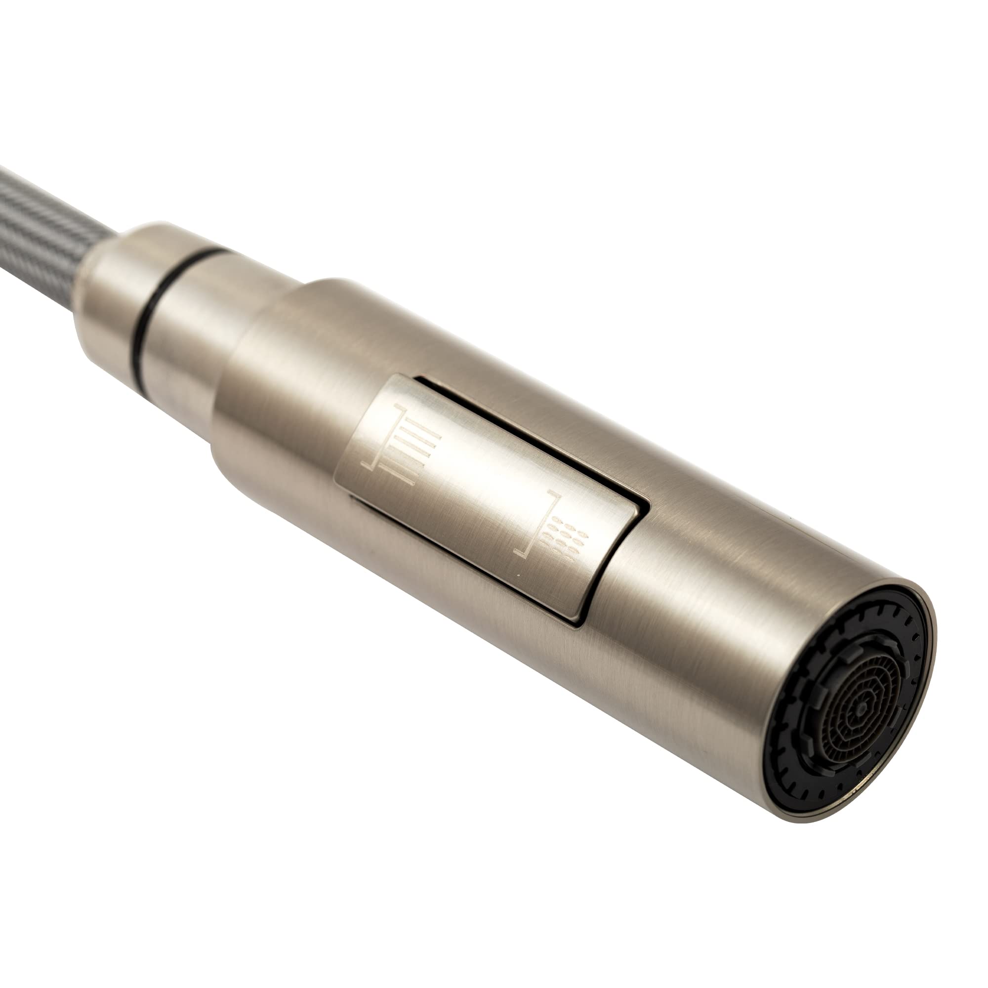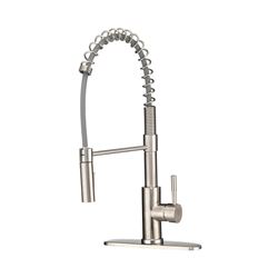 The Dura Faucet DF-MK504SLK-SN is a commercial-style kitchen faucet designed specifically for RV and van applications, featuring a high-arc spring design with a pull-down sprayer that offers both aerated and spray stream options. This single-handle faucet stands 22 inches tall, providing ample clearance for washing large pots and pans in your mobile kitchen.