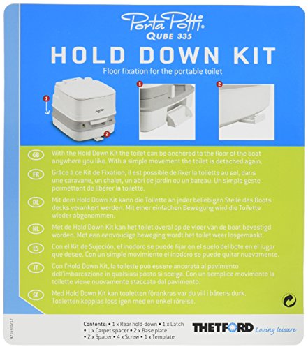 The Thetford 92921111 Hold Down Kit provides secure mounting for your portable toilet during travel and use. This essential accessory prevents your Porta Potti from shifting or tipping, ensuring safety and stability in marine, RV, and camping applications.
