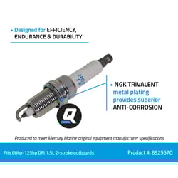 The IZFR5J spark plugs come pre-gapped as specified by your engine manufacturer. Use only the spark plug listed in your engine owner’s manual. Using the wrong plug can reduce optimum performance, reduce fuel economy or cause damage to your engine. Spark plugs are easy to change with common spark plug sockets. The NGK pure alumina silicate ceramic insulator provides superior strength, reduces breakage and better heat transfer. The ribbed suppressor seal extends resistance and prevents spark “flash over” and misfire. The Quicksilver brand is the leader in delivering uncompromising engine oils, parts and accessories to the marine industry for over 65 years. Quicksilver is the premier supplier of Mercury Marine original equipment replacement engine parts, oils, and accessories, but also works to serve all original equipment brands in the marine and powersports industries. It has earned a loyal following by providing the highest quality products that are tested through some of the most rigorous environments and testing procedures. No aftermarket company comes close to the level of research and design as Quicksilver; buying Quicksilver is buying performance, protection and peace of mind.