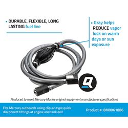 The Quicksilver 8M0061886 is an 8-foot marine fuel line assembly designed for Mercury, Mariner, and Force outboard engines that utilize clip-on type quick disconnect fittings. This complete fuel system component features integrated quick-connect fittings for both the engine and fuel tank, along with an EPA-compliant primer bulb for reliable fuel delivery.