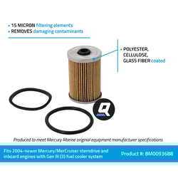 The Quicksilver 8M0093688 is a high-performance water separating fuel filter designed specifically for MerCruiser sterndrive and inboard engines equipped with Gen III fuel cooler systems. This genuine Mercury Marine OEM replacement filter protects your engine by removing water moisture and fuel-borne contaminants before they can cause performance loss or damage.