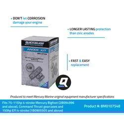 The Quicksilver 8M0107548 Aluminum Anode Kit provides essential corrosion protection for select Mercury and Mariner outboard motors. This complete 4-piece anode kit is specifically designed for 75-115hp Mercury or Mariner 4-stroke Big Foot and Command Thrust gear cases (serial number 2B094996 and up), as well as 150hp EFI 4-stroke models (serial number 1B905505 and up).