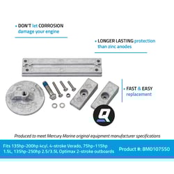 The Quicksilver 8M0107550 Aluminum Anode Kit provides essential corrosion protection for Mercury outboard engines. This complete 4-piece kit is specifically engineered for 135-200hp 4-cylinder Mercury Verado outboards and 75-115hp and 135-250hp OptiMax outboards, delivering reliable defense against the damaging effects of galvanic corrosion in both freshwater and saltwater environments.
