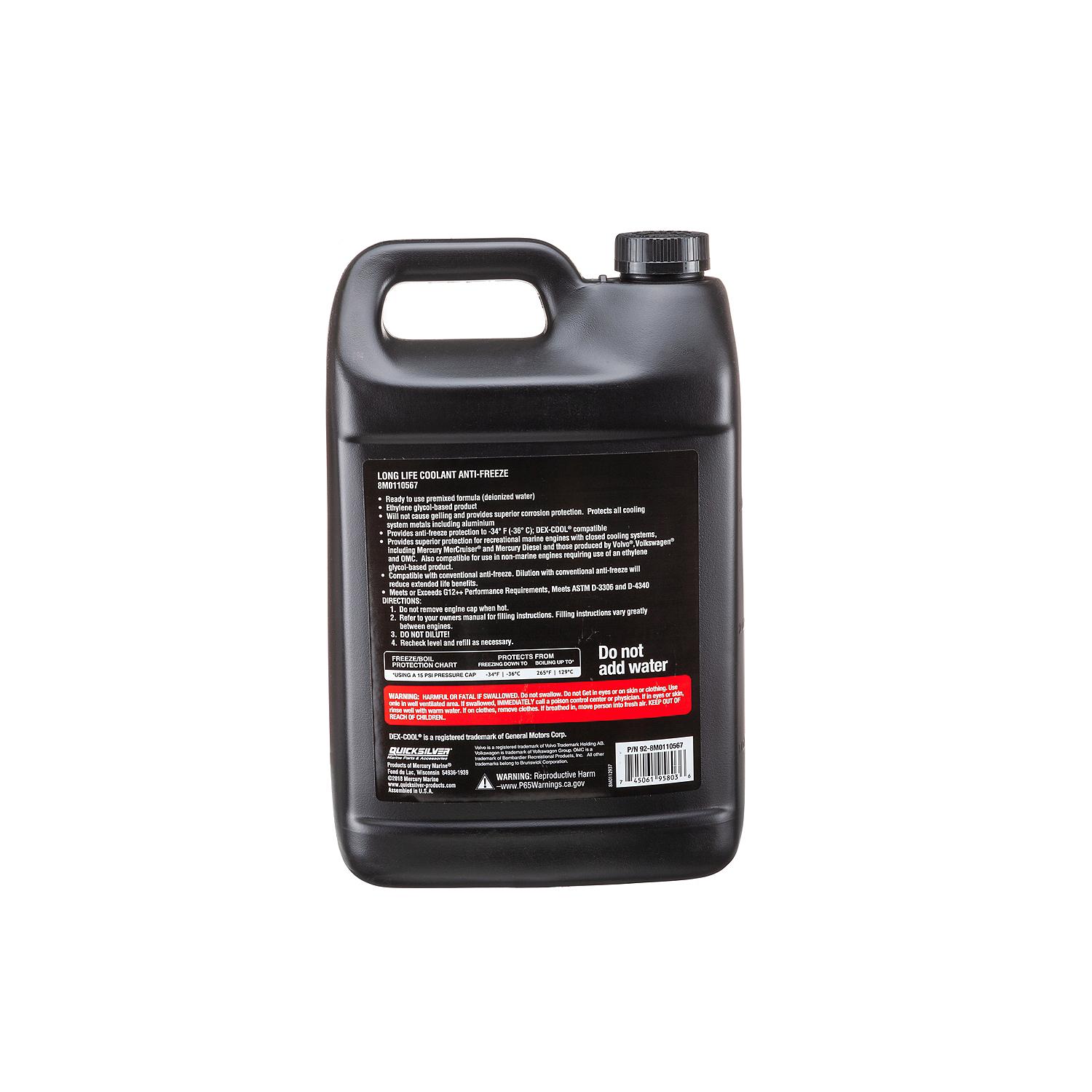 Long life coolant/antifreeze 8M0110567 is for use in all MerCruiser closed cooling systems in sterndrive and inboard gasoline engine applications. This coolant is pre-diluted to a 50/50 mix with de-ionized water. See your owner's manual or service manual for specific application and instructions. The Quicksilver brand is the leader in delivering uncompromising engine oils, parts and accessories to the marine industry for over 65 years. Quicksilver is the premier supplier of Mercury Marine original equipment replacement engine parts, oils, and accessories, but also works to serve all original equipment brands in the marine and powersports industries. It has earned a loyal following by providing the highest quality products that are tested through some of the most rigorous environments and testing procedures. No aftermarket company comes close to the level of research and design as Quicksilver; buying Quicksilver is buying performance, protection and peace of mind.