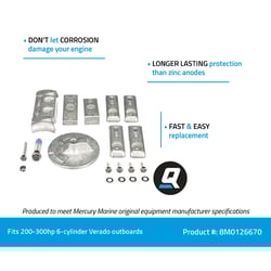 The Quicksilver 8M0126670 is a complete anode kit designed specifically for Mercury 200-300hp L6 Verado outboard engines. This comprehensive kit replaces all factory-installed anodes located on the transom and gear case, providing essential corrosion protection for your outboard in both saltwater and freshwater environments.